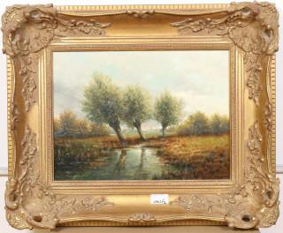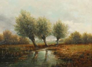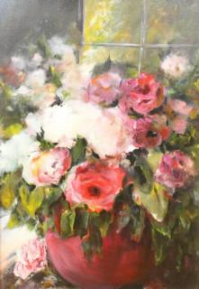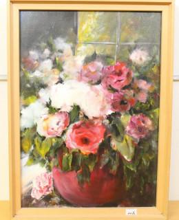 Landschap. Hierbij doek, rozen in een vaas door H. Ekkers