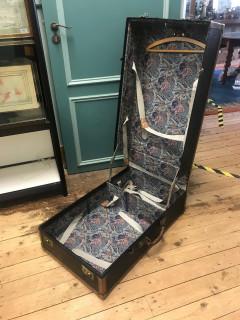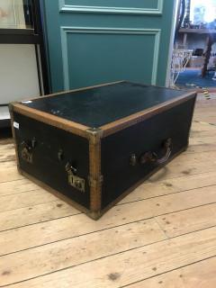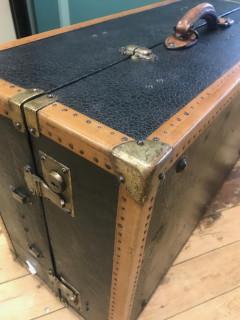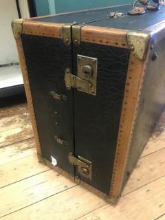 met bruin lederen banden en messing hoekstukken. Scharnieren en sloten aan de korte zijde. Binnenzijde met stof bekleed