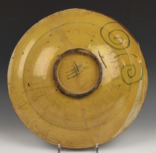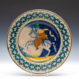 het plat met voorstelling van Ottomaanse lancier te paard, de rand met cirkelvormige voluten, de achterijde met geel lusterglazuur (gerestaureerd)