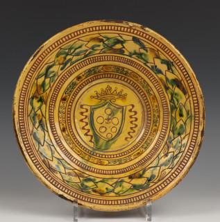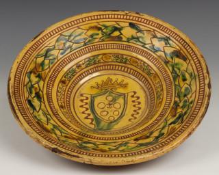Hierbij een (defecte) antieke albarellomet geel-groen glazuur en deeld gekerfd decor van o.a. gekroond wapenchild
