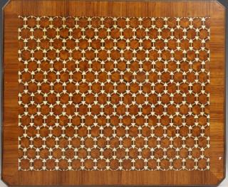 op de deksel ingelegd eometrisch patroon van sterren, met koperen bies. Met sleutel (lichte fineerschade aan zijde)