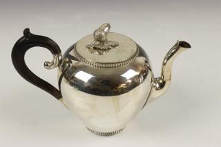 eivormig model theepot met houten voluutvormig oor, knop in vorm van eikel en blad(defect), mt. Bonebakker & Zn., en tevens winkelier Amsterdam 1888, 1e gehalte