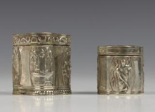 beide cartouche vormig en scharnierende deksels, één met vijf diverse "landelijkleven" voorstellingen, mt. "bloem"(niet geïdentificeerd), Amsterdam 18e eeuw en een met voorstelling van heiligen figuren en de godin van de jacht Diana op deksel, mt. mogelijk Fa. gebroeders Deelman Groningen en fantasiekeuren, 2e gehalte 19e eeuw,