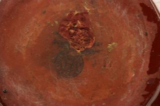 met bruin glazuur en groen en wit slibdecor. Gemerkt vh Amstelhoek