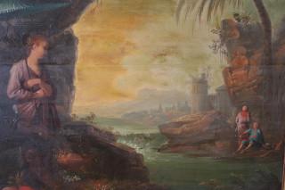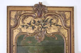 met schilderij in cartouche met romantische scene. Het houten paneel versierd met florale motieven in reliëf.