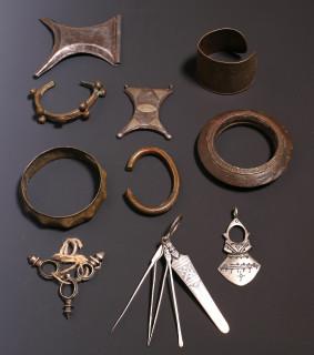 West Africa, some bronze and brass bracelets and Toeareg, some amulets and a metal set for personal care