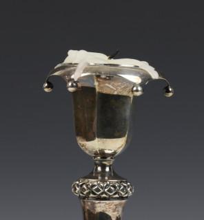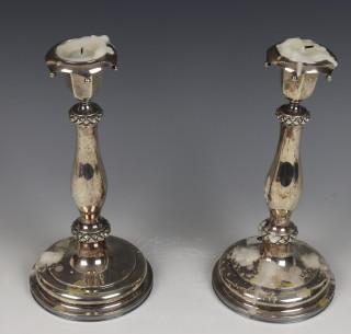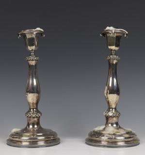 rond model met balustervormige stam met twee bewerkte randen en zeshoekig houder, met bobèches versierd met zes bolletjes, mt. Johannes Cornelis Schouten Amsterdam 1843, winkelier Fa. Bonnebakker & Zn. Amsterdam, 1e gehalte, één met houten voet vulling,