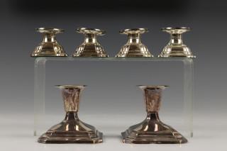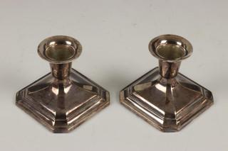met vierkanten getrapte gevulde voet, mt. J. Grimminger Schwäbisch Gmünd, 2e gehalte. Hierbij paar onedele kandelaren