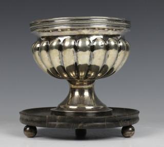 gelobd met geribde rand, op houten ronde voet met drie zilveren pootjes, met koperen binnenbakje 1834, 2e gehalte, restauratie,