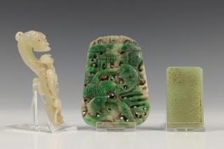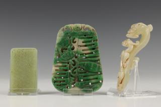 bestaande uit een jade gordelhaak, een appelgroen snijwerk met vissen en een celadon jade plaue