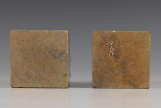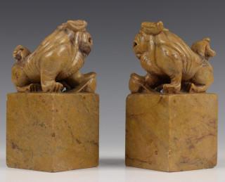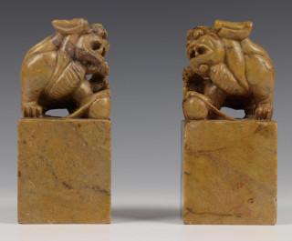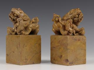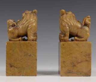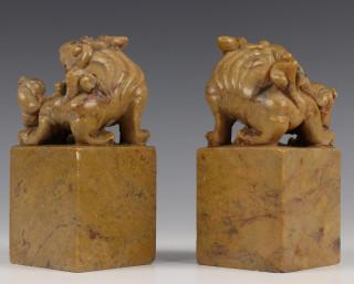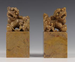 China, twee spekstenen zegels met boeddhistische leeuwen, ca. 1900