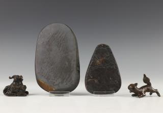 China, twee inktstenen en twee bronzen gewichtjes, 19e eeuw,