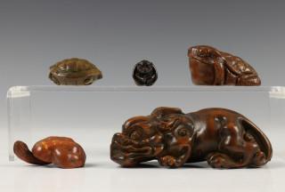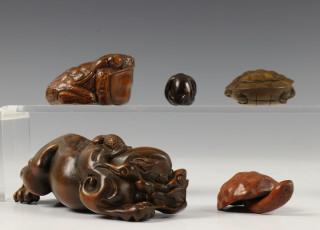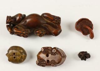 Japan, een buxushouten okimono en vier netsuke, 19e-20e eeuw,
