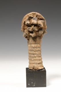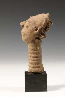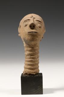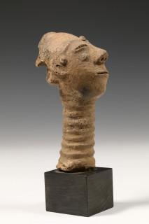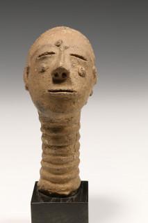 Ivory Coast, Krinjabo terracotta head with ringed elongated neck, sharp nose, slit-shaped eyes and mouth.
