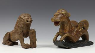 hierbij een houten gestoken leeuw, de rechter poot rustend op een paal met kruis.