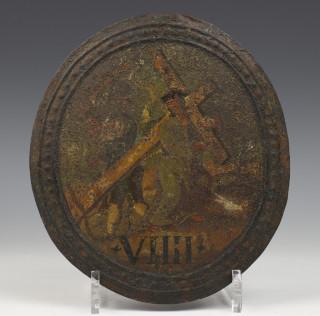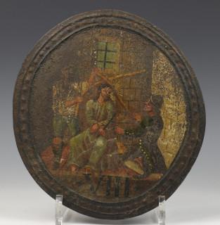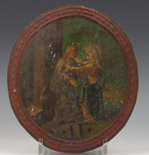 allen met rond polychroom beschilderd schild met scenes uit het leven van Christus. Compleet met wand bevestiging. (beschadigingen).