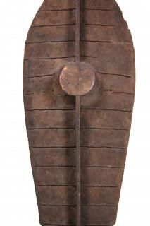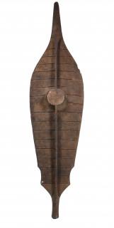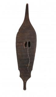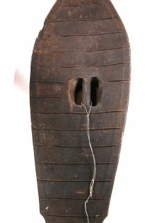 decorated with tapering carving and horizontal lines of plant fibers, faceted edge. With a bulbous cilindrical decoration in the front and a handle grip carved at the back. (small damage) Ex collection Rob Kok, Amsterdam Tribal Art collector and dealer.