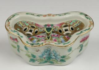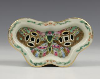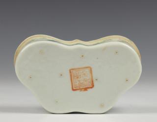 met famille rose decor, in vorm van vlinder. Met in rood gestempeld zegelmerk