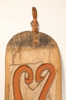 decorated with three rows of S-shapes broadening towards the top and topped by a seated male ancestral figure. With plant fibre tassels. Private collection Rob Kok, Amsterdam Tribal collector and dealer