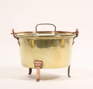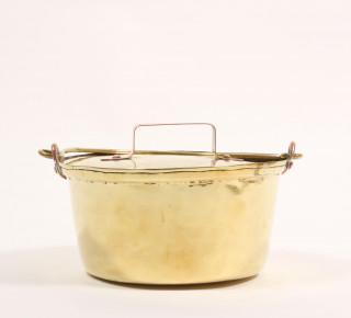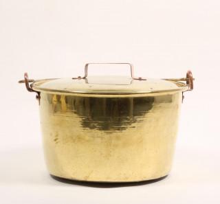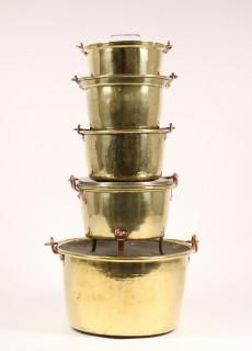 Serie van vijf geel koperen deksel pannen, 19e eeuw,