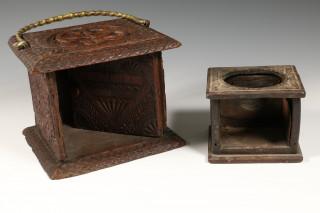 voorzien van een Turkse knoop, initialen binnen een hart vorm op het deurtje en een koperen handvat, latere datering 1621. Hierbij een houten Friese kerfsnede thee stoofje. (beschadigingen).