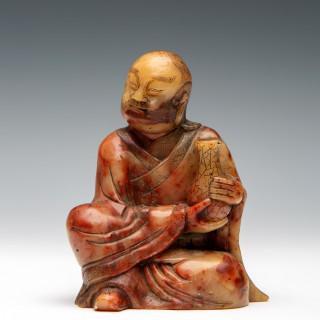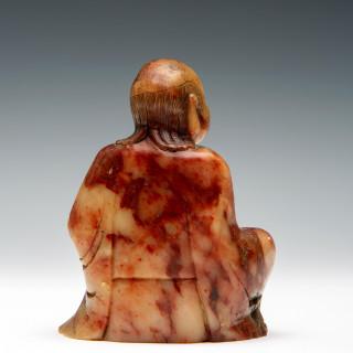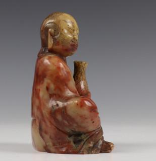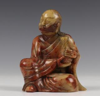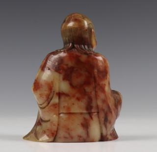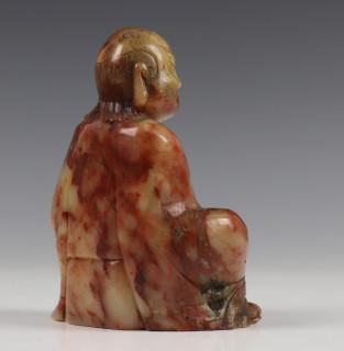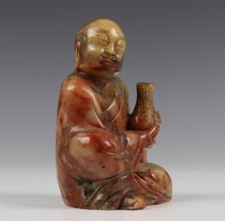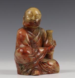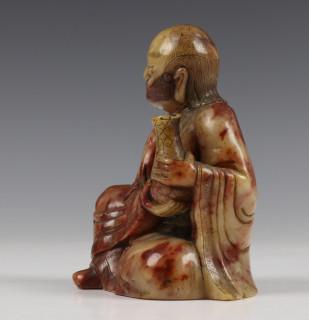China, spekstenen sculptuur van zittende Taoïstische Onsterfelijke met fles in de hand, vroeg 19e eeuw.