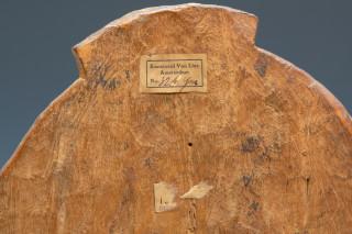 stone carved oval shield, the top carved with a raised wedge and a design of eyes, zoomorphic forms, circle motives and an anthropomorphic face. The plane decorated with two larger carved diamond shaped forms with a star- and diamond shape within, both with indentations on the outer rim. The shield painted with natural pigments in black, white and red. Collection of Fred Carasso (1899-1969) an Italian born famous Dutch sculptor and collector of fine Arts, thence by descent. Ex-collection Carel van Lier. The early label number 32 suggests according to grandson Bas van Lier, that this shield was acquired somewhere in the 1920’s. At the back written numbers and the remnants of another old label