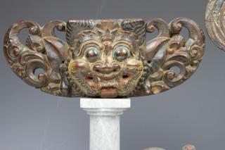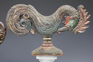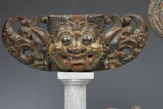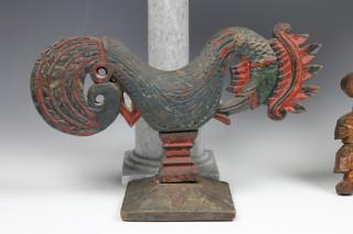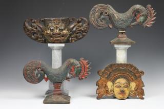 Bali, carved wooden Barong mask panel and a pair of wooden polychrome roosters, ca. 1900.