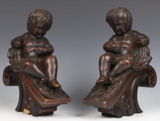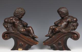 Stel gestoken houten kast ornamenten in de vorm van gezeten putti, 19e eeuw.