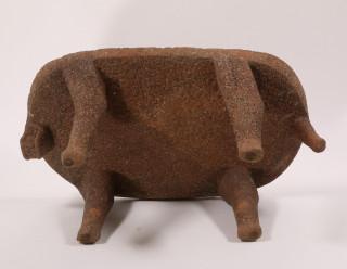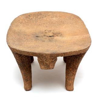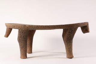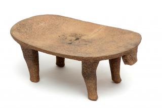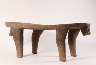 in the shape of a stylized leopard. The edge of the curving polished top and the legs decorated with carved circles. At the front a carved stylized leopard head and a short tail at the back. With a natural crack over the middle. Provenance America Antiqua, Tilburg, 1999 and Private Dutch collection since. With invoice.