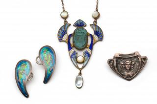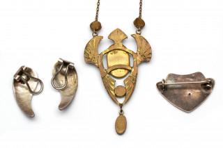 Zilveren broche, onedele hanger, Art-Nouveau en een paar oorclips, Arts and Crafts
