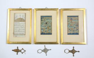 hierbij een ingelijste arabische tekst en drie koperlegering pendanten.