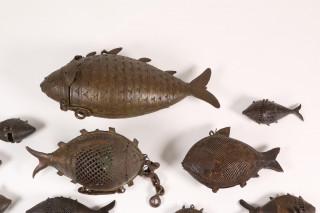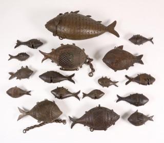 India, collectie van zeventien koperlegering geurmandjes in de vorm van een vis