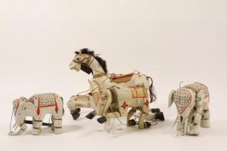 India, vier marionet poppen; twee olifanten, een os en een paard
