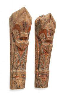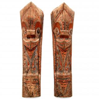 Sumatra, Batak, pair carved wooden Singha heads being architectural ornaments