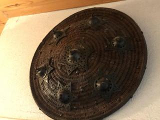 Aceh, woven rattan shield and a brass shield, both a peurise