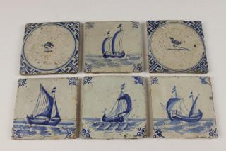 Zes blauw aardewerk tegels, vroeg 18e eeuw,