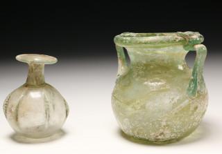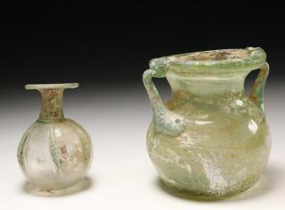 A large Roman glass beaker with two ears, 2nd-3rd century and a small thin Roman glass sprinkler, 3rd-4th century,