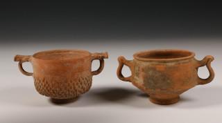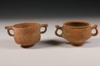 Two Hispano-Roman red earthenware beakers with handles, 1st-3rd century,