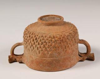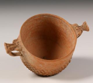 one decorated with pointed high relief and handles in stylized zoomorphic shapes.