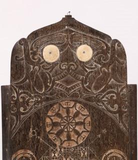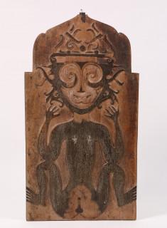 with ancestral- and mythological figure, calender, symbols and two inlaid shells.