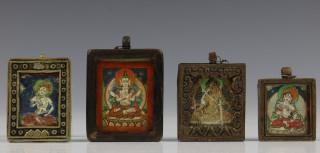 Mongolië, vier ga'u, amuletdoosjes; met afbeedlingen van Witte Tara, Sadakshsari Avalokiteshvara en twee Vajrasattva, eind 19e eeuw