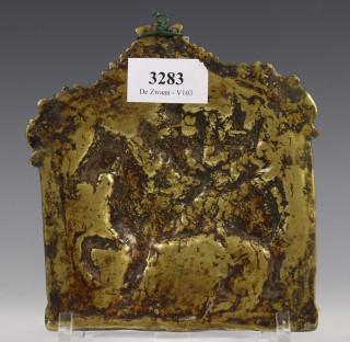India, koperen plaquette, Khandoba; Shiva en Parvati op een wit paard, 16e/17e eeuw