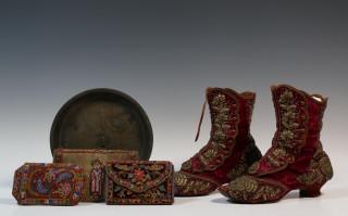 drie met glas-kraaltjes versierde portemonnees en een koperlegering schaal