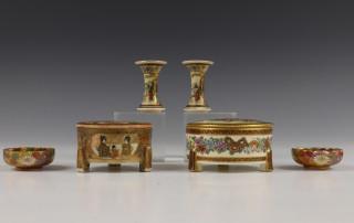 met geschilderd decor van figuren in landschap. Hierbij een paar miniatuur trompetvazen en twee miniatuur schaaltjes met 'mille fleur' decor. Allen gesigneerd. (één dekseldoos hersteld).