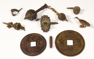 Southeast Asia, collection of eight brass objects and China, two big metal coins