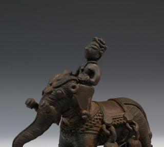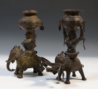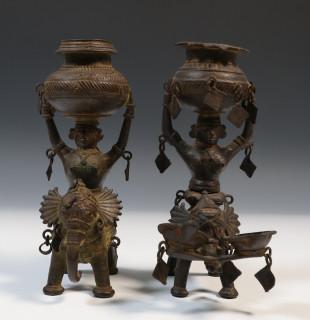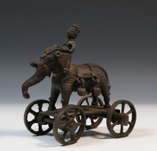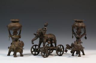 India, metal Temple Toys; elephant and rider on wheels and two temple servants, one with oil lamps