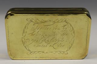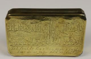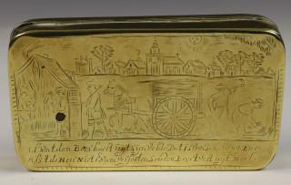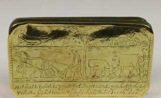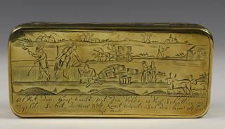 Geelkoperen tabaksdoos met scenes uit het boeren leven, 18e eeuw,