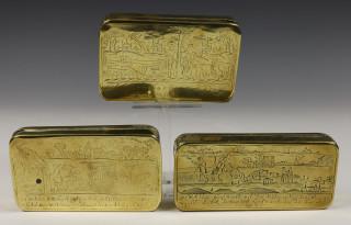 o.a. gegraveerd: 'De lantbou kunst is mijn lust, 't ploege mijn behagen, het sligte met den eg, het rijden met een waage'. Hierbij twee andere koperen tabaksdozen mbt. het boeren leven.