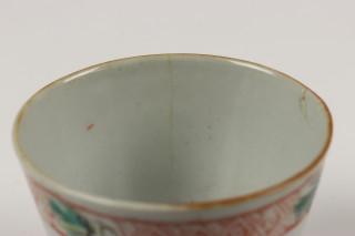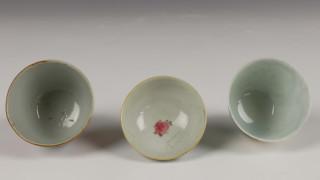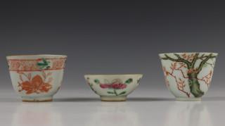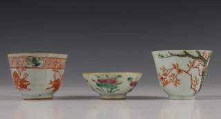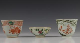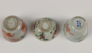 China, drie polychrome porseleinen theekommen, late Qing periode,